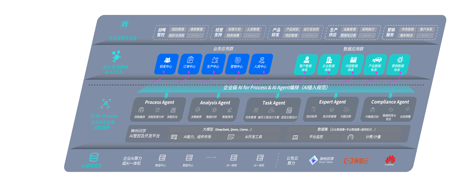 端到端的一站式AI工作空间深度融合了从企业战略规划到日常经营的全流程业务板块,,,定向解决车企内部领域多、、、、部门多、、、、链条长、、、、场景碎片化等难题,,,,支持车企快速构建以AI为核心的生产力写作体系,,,,实现任务执行与AI能力的无缝集成与交互