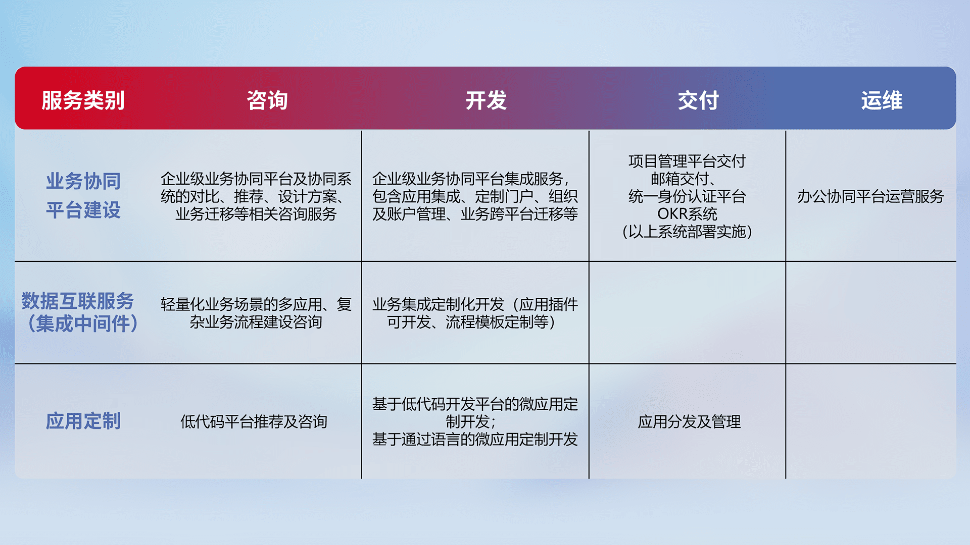 针对钉钉、、、企微、、IDaas等平台级产品提供产品的规划、、方案、、、交付、、、定制化开发等服务,,,,实现如统一协同办公、、、智能客户服务、、、、混合会议管理、、、智能数据查询、、、、等业务场景,,实现数字化转型。。